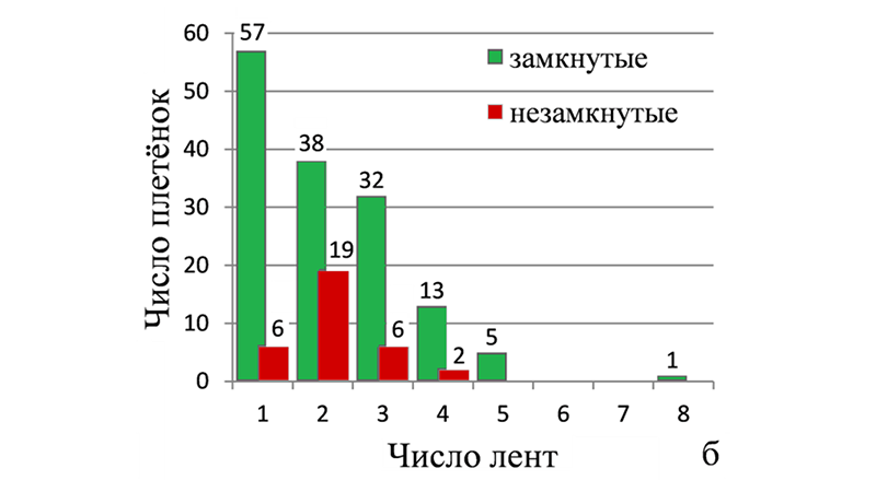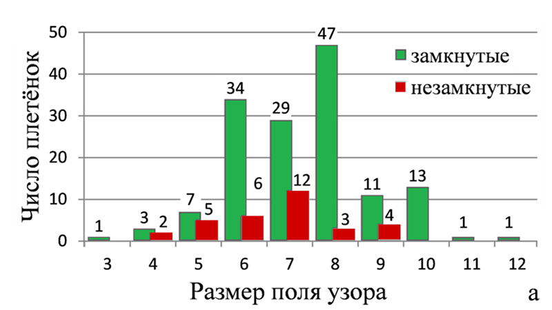 Рис. 1. Распределение 179 образцов плетёнок: а — по размеру поля, б — по числу лент