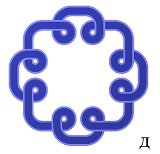 Узлы классифицируют по понятию сложности. Простейший (незапутанный) узел, где число пересечений N=0, называют тривиальным (рис. 3а). Среди монгольских плетёнок имеются образцы, казалось бы, с множеством пересечений, которые, однако, изотопны тривиальному узлу, т.е. их можно распутать (Рис. 3, б–д), используя первое движение Рейдемейстера [5, с. 124]. Узлы изотопны, если один из них можно непрерывно продеформировать в другой [5, с. 122]. Вопрос об изотопии двух узлов — главный в теории узлов. Этот вопрос очень сложен, математики не могут решить его уже более полутора веков. Существующий алгоритм невозможно реализовать на современных компьютерах, однако частные решения оказались чрезвычайно важны и применимы не только в математике, но и в физике, генетике, гидродинамике и других не чисто математических направлениях исследований.
