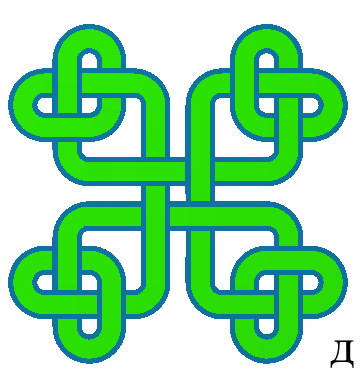 Рис. 2. Примеры монгольских плетёнок: а — «улзы» на сетке 5´5 клеток, б–г — зацепления из двух, трёх и четырёх лент