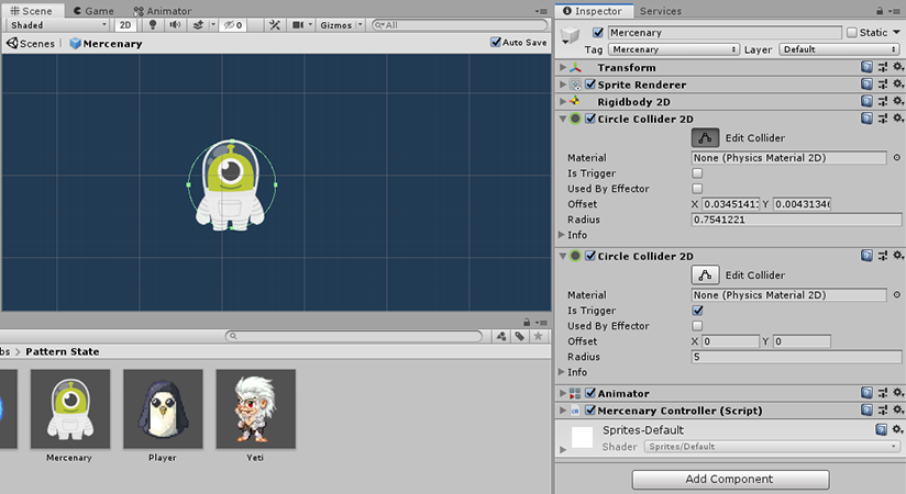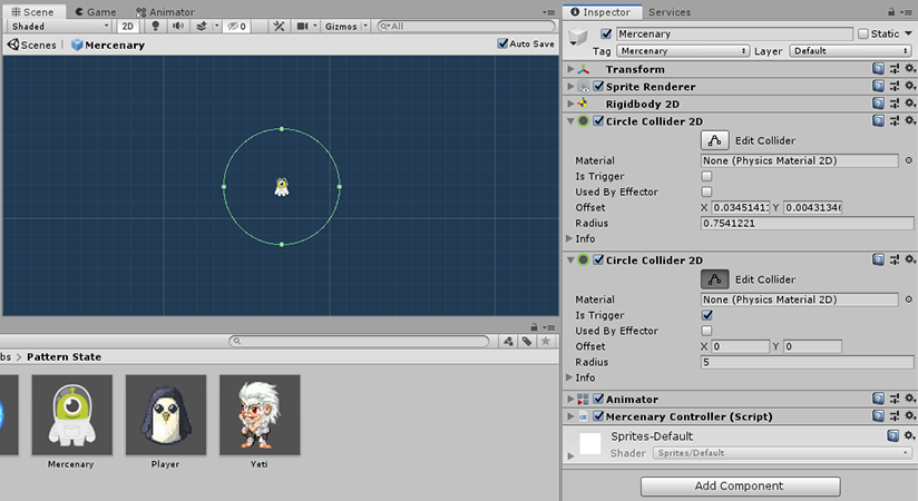 Обратим внимание на такой компонент как Circle Collider 2D [3] — коллайдер, используемый с 2D-физикой, являющийся кругом с заданной позицией и радиусом в координатах локального пространства объекта. Как можно заметить, у каждого объекта есть 2 таких коллайдера. Один из них является простым коллайдером, который при столкновении с коллайдером другого объекта использует физику 2D, другой — является триггером, который не работает с физикой (устанавливается при активации поля «Is Trigger»). В данном случае он является границей области видимости конкретного объекта. Примеры представлены на рисунках 12, 13.