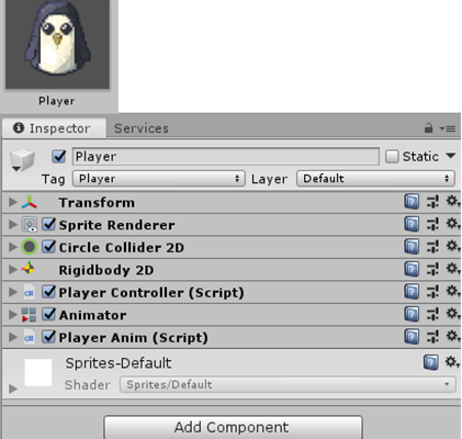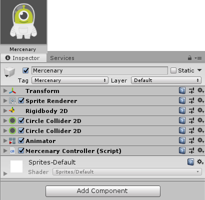 Из основных настроек объекта использовались тэги — такие маркеры, которые используются для идентификации объектов. Существуют как стандартные маркеры, так пользовательские, которые можно добавлять с помощью менеджера тегов слоев (рис. 11). В приложении были использованы следующие тэги: Player (стандартный тэг), Wall, Enemy, NPC и Mercenary.