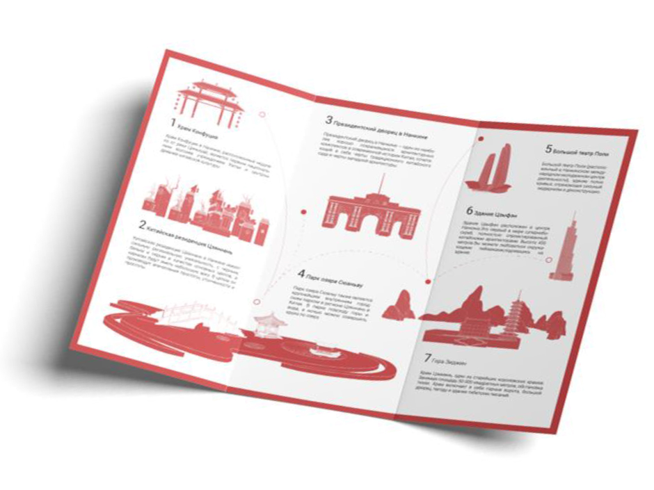 Особенно ярко удалось совместить разные форматы представления материала в путеводителе (рис. 7). Учитывая тот факт, что путешествие предполагается, прежде всего, виртуальное, бумажный путеводитель носит исключительно тезисно-ознакомительный характер. Однако, пользуясь технологиями дополненной реальности, турист всё же сможет попутешествовать по достопримечательностям Нанкина, несмотря на то, что они помещаются у него на ладони. Подобные буклеты-путеводители представлены в проекте по всем направлениям путешествия: архитектуре, культуре, гастрономии и образованию.