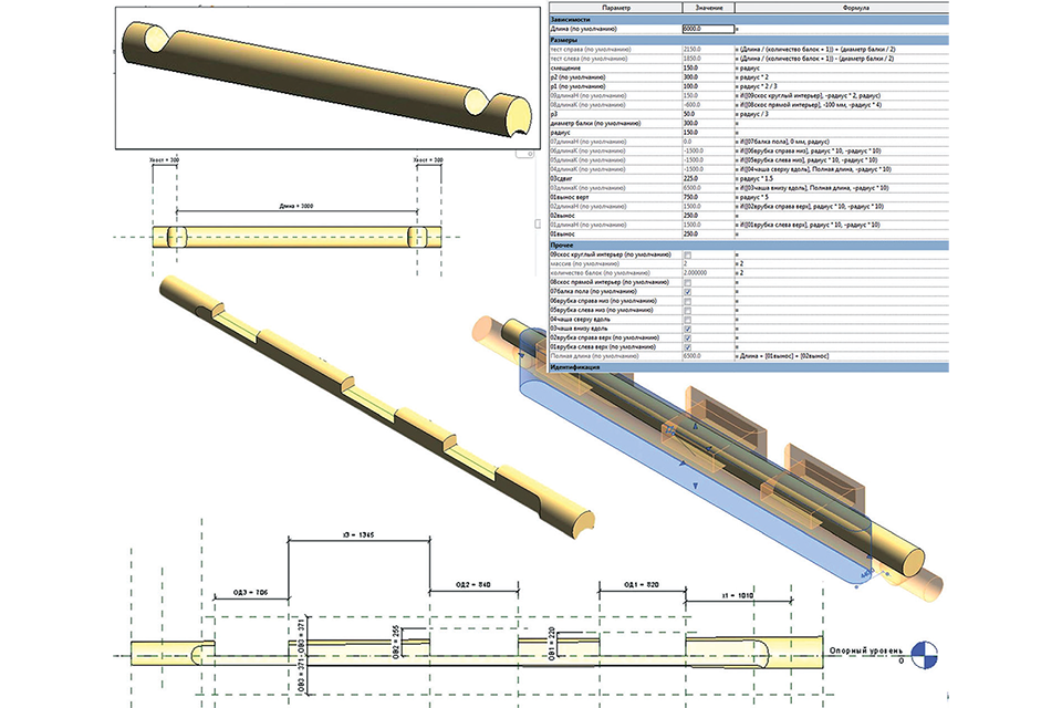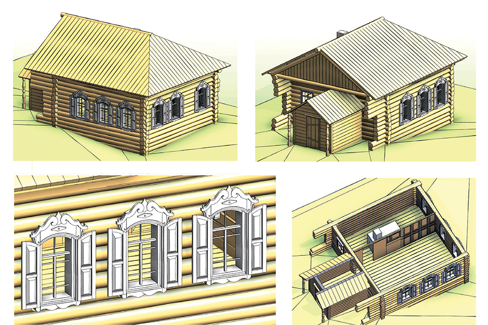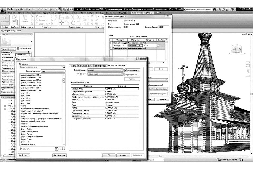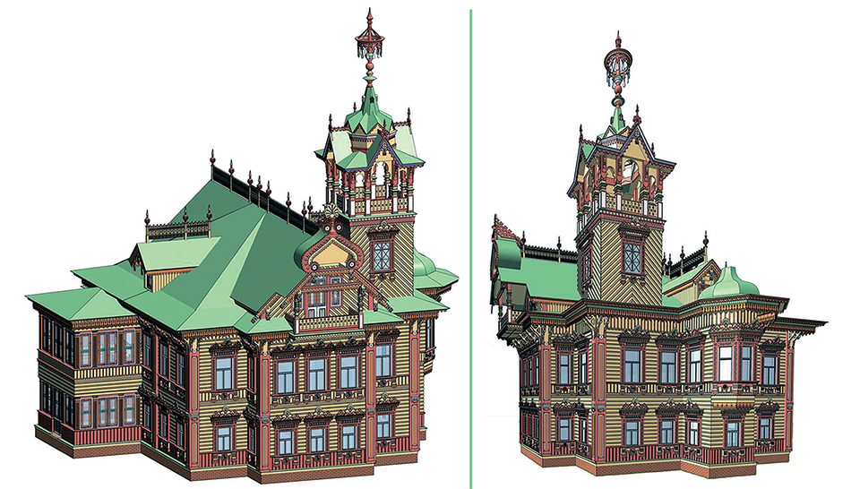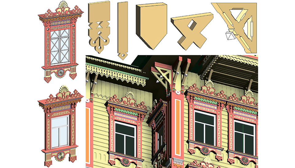 В статье А. Ю. Майничевой, В. В. Талапова и С. О. Куликовой рассматривается практическое применение созданной библиотеки универсальных многопараметрических семейств бревен в реставрации терема в псевдорусском стиле в с. Асташово Костромской области (рис. 2). Цифровое BIM моделирование для разборных объектов, к которым относится деревянная архитектура, подразумевает и дискретность самой BIM модели, возможность воспроизведения и анализа каждого элемента в отдельности. Кроме моделирования элементов конструкции русских деревянных построек моделируется система их соединений, что позволяет сформировать так называемые «многопараметрические семейства интеллектуальных бревен» [1].