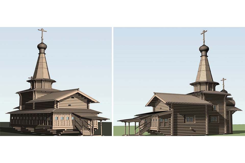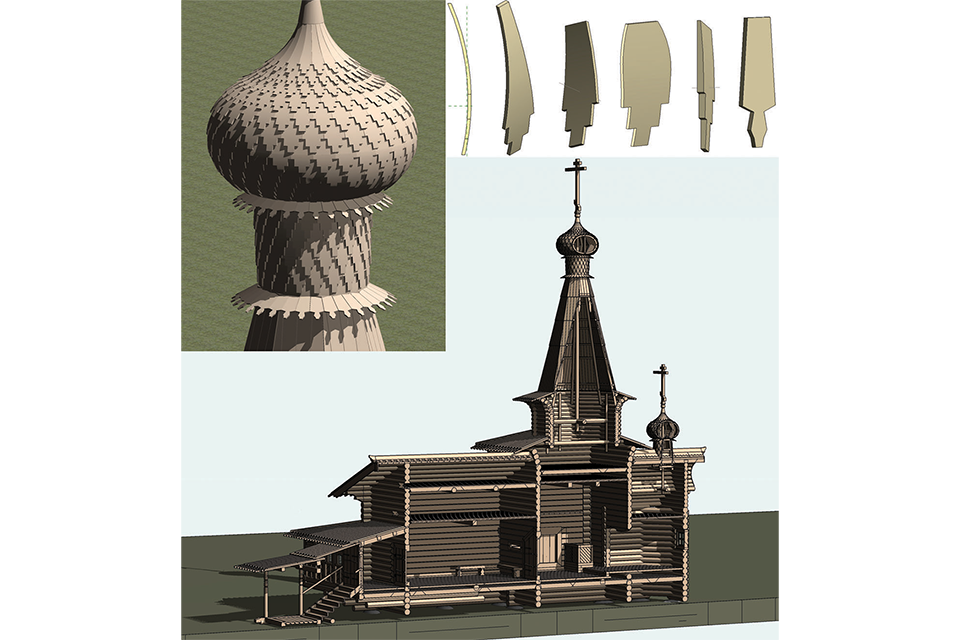Требования, предъявляемые к компьютерной реконструкции таких уникальных объектов, как памятники деревянного зодчества предполагают индивидуальный подход к работе в каждом конкретном случае. В работе Т. И. Козловой и В. В. Талапова, на основе комплексного исследования была создана архитектурная модель Спасо-Преображенской церкви Зашиверского острога, как типичного образца архитектуры шатровых церквей Московской Руси. Это было сделано не с целью построения формы (геометрии), но главным образом с целью воссоздания информации об уникальных элементах на основании архивных данных, литературных источников, уцелевших конструкций, а также для контроля их состояния (рис. 4) [3].