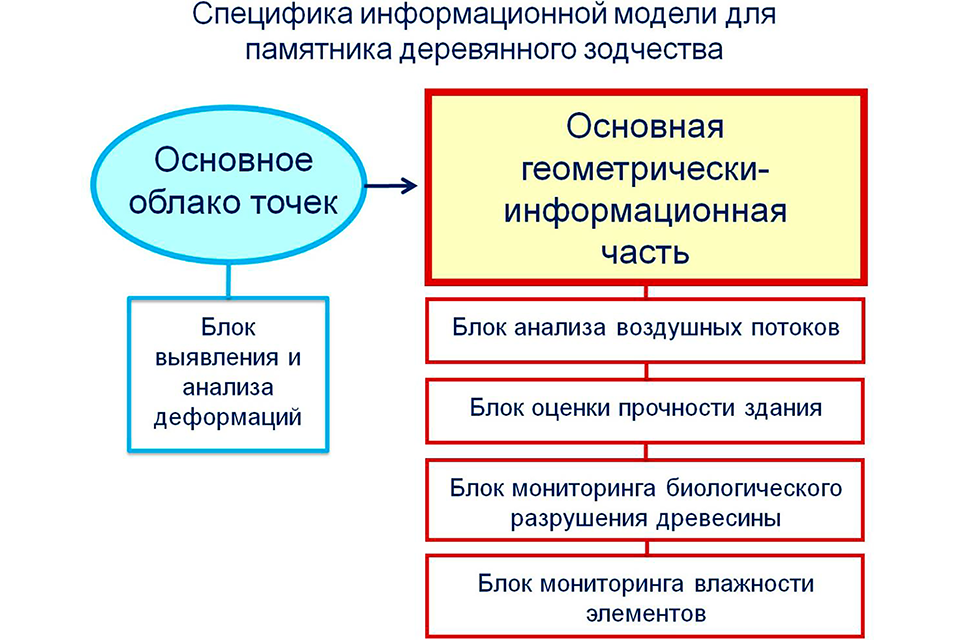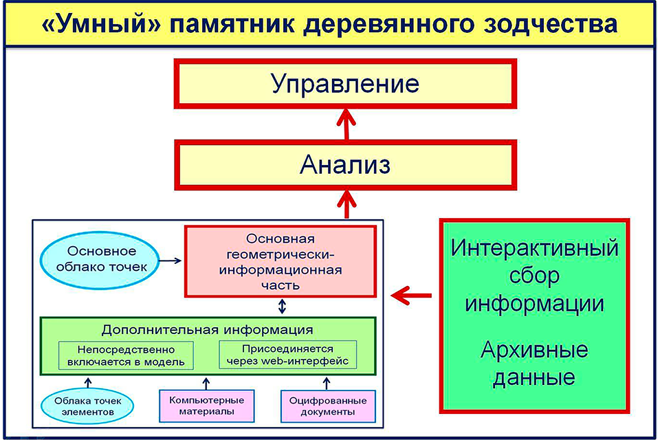 Сохранение и изучение объектов культурного наследия предусматривает тщательную междисциплинарную подготовку, включая мониторинг и сбор данных об объекте исследования, выполнение натурного обследования, обмерных чертежей, а также их последующий ввод в цифровую информационную систему, анализ исторических материалов, обработку и систематизацию (рис. 1). Как следует из схемы В. В. Талапова, единственной современной технологией получения реальной формы (геометрии) здания является лазерное 3D сканирование, которое становится неотъемлемой частью процесса информационного моделирования памятника архитектуры.