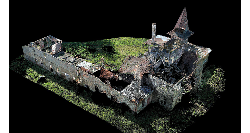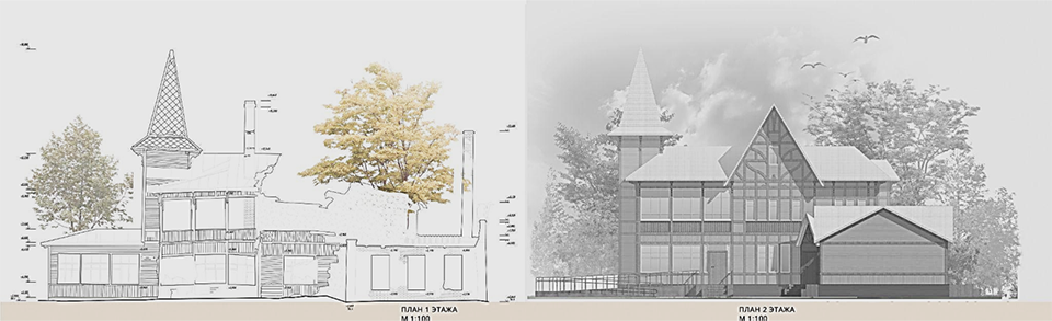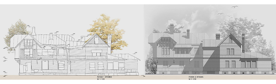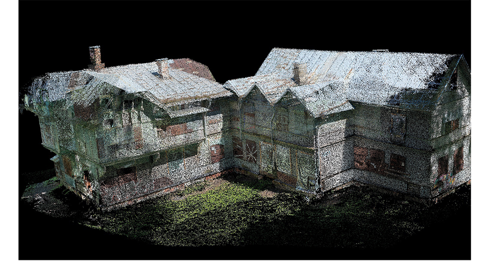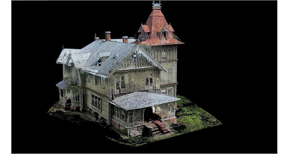С 2011 года, Основной образовательной программой «Дизайн среды», а затем Центром по изучению, сохранению, реставрации и актуализации культурного наследия Санкт-Петербургского государственного университета и Музейно-архитектурной клиникой СПбГУ, ведется работа по оцифровке архивных чертежей НИИ «Спецпроектреставрация» ансамбля деревянных дач бывшей деревни Бобыльская М. Н. Бенуа, А. А. Грубе и Л. И. Крона (ныне Петродворцовый район Санкт-Петербурга) [6, с. 8], их натурному изучению и разработке концепции приспособления к современному использованию в целях актуализации и ревитализации. При поддержке Всероссийского общества охраны памятников истории и культуры (ВООПИИК) и кафедры Геодезии землеустройства и кадастров СПбГАСУ были получены цифровые копии этих дач («облака точек») (рис. 6, 7), на основании которых были выполнены чертежи фасадов данных объектов культурного наследия в современном состоянии (рис. 8). Следуя изученной методике информационного моделирования памятников деревянного зодчества, планируется создание трехмерных моделей трёх дач бывшей деревни Бобыльской, которая будет не только выполнять учебно-просветительскую и коммуникационную функции, но и может использоваться в дополненной реальности (ДР) и / или виртуальной реальности (ВР).